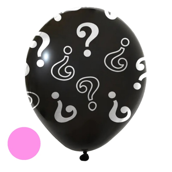 Latexový balónek s celoplošným potiskem otazníků, který může schovávat barevné konfety k odhalení pohlaví miminka.