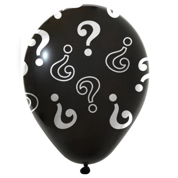 Latexový balónek s celoplošným potiskem otazníků, který může schovávat barevné konfety nebo doplňovat buket k odhalení pohlaví miminka.