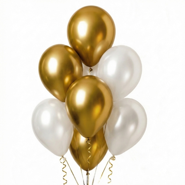 Hotový balonkový buket v nadčasové kombinaci zlaté chromové a bílé metalické barvy patří mezi stálice slavnostní výzdoby. Sedm latexových balónků o velikosti 30 cm vytváří vyvážený a reprezentativní celek, který funguje samostatně i jako součást větší dekorace. Buket se skvěle hodí na svatby, jubilejní narozeniny, firemní eventy, plesy i luxusně laděné oslavy, kde chcete čistý a elegantní vzhled bez zbytečných barevných kombinací.Balónky jsou určené k plnění vzduchem i héliem. Při naplnění héliem se buket krásně vznáší a v kombinaci se stuhami nebo závažím na balónky působí velmi profesionálně. Bílo-zlatá kombinace se snadno kombinuje s dalšími dekoracemi a je oblíbená i jako doplněk do fotokoutků nebo ke slavnostním vstupům.