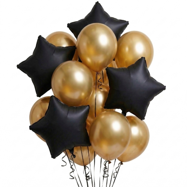 Tento balonkový buket ve zlaté a černé kombinaci působí velmi elegantně a luxusně. Zlaté latexové balónky o velikosti 30 cm doplňují kontrastní černé fóliové hvězdy o velikosti 45 cm, které celé dekoraci dodávají výrazný a moderní vzhled.