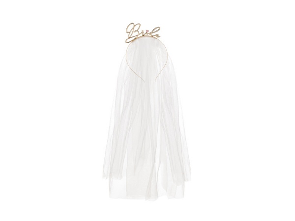 Party doplněk pro nevěstu na rozlučku se svobodou. Čelenka s nápisem Bride (Nevěsta) se závojem ve zlaté barvě, která se hodí pro nevěstu v její rozlučkový den ale i jako rekvizita do fotokoutku.