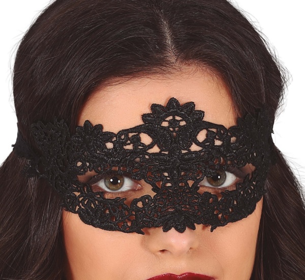 Černá Benátská škraboška napodobující krajkový vzor. Prolamovaná škraboška drží na hlavě díky zavazování ze saténové stuhy.