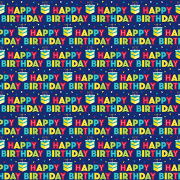 Dárkový narozeninový balící papír se vzorem nápisu Happy Birthday modrého podkladu. Balící papír v roli o velikosti 75 x 150 cm.