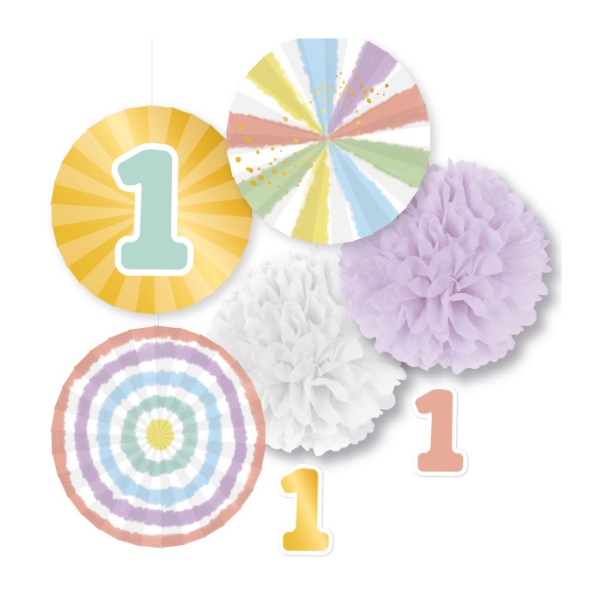 Dekorační sada Rainbow - 1st Birthday - která Vám pomůže docílit perfektní dojem z dekorace na prvních narozeninách vašeho drobátka. Sada obsahuje 5 závěsných dekorací jako jsou pom pomy nebo rozety.
