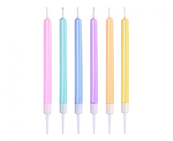 Dortové svíčky v makronkových barvách s držátky pro bezproblémové upevnění na narozeninový dort v metalických barvách. Udělají radost každému oslavenci, nejen dětem.
