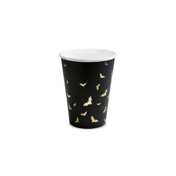 Parametry:Materiál: papír (EKO)Objem: 220 mlBarva: černá se zlatým potiskem netopýrůPočet v balení: 6 ks