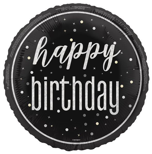Foliový balonek s tematickým oboustranným potiskem Happy Birthday v černé barvě s holografickým efektem, ve velikosti 45 cm. Balonek využijete jako dekoraci nebo dárek k narozeninám. Balónek lze plnit vzduchem i héliem a po nafouknutí héliem létá opravdu dlouho.