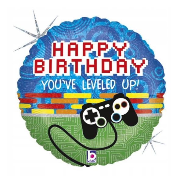 Fóliový balonek Game Controller Birthday s textem „Happy Birthday – You've leveled up!“ je ideálním dárkem nebo dekorací pro každého fanouška videoher. Design inspirovaný retro pixely, pestrobarevnými prvky a herním ovladačem vynikne na každé narozeninové oslavě – ať už pro dítě, teenagera nebo dospělého hráče. Výborně se hodí do výzdoby tematické herní párty nebo jako doplněk ke sladkému baru.