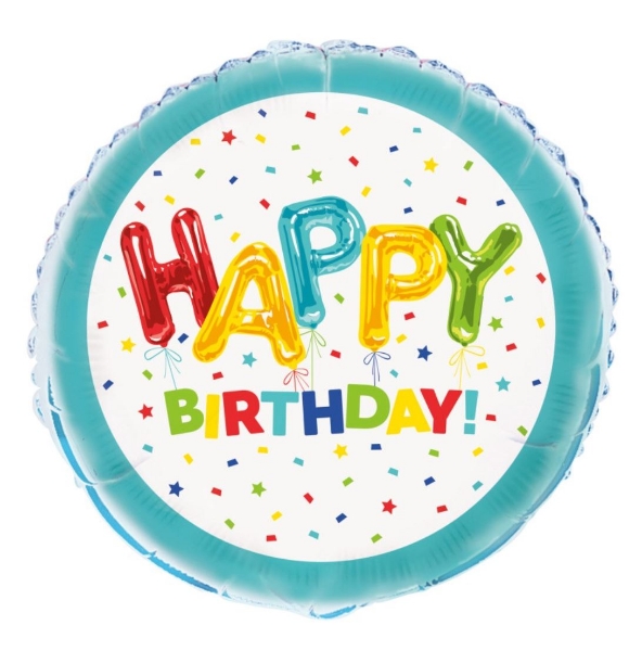 Tento kulatý fóliový balónek s nápisem „Happy Birthday“ a barevným potiskem balónků je veselým doplňkem každé narozeninové oslavy. Balónek lze nafouknout vzduchem nebo héliem – při naplnění héliem se vznáší a zůstává plně nafouknutý přibližně 5–7 dní. Pokud je nafouknutý vzduchem, nelétá, ale vydrží nafouknutý i několik měsíců. Díky samouzavíracímu ventilu se snadno používá bez nutnosti dalšího vázání. Balónky jsou baleny v obchodním obalu a skvěle ladí s dalšími produkty z kolekce Happy Birthday – balónky a konfety.