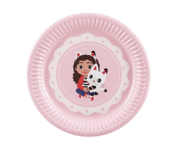 Papírové talíře Gábinin kouzelný domek s oblíbenými postavičkami z pohádkového seriálu se stanou nepostradatelným doplňkem každé dětské oslavy. Díky průměru 18 cm jsou vhodné především na dort, zákusky, ovoce nebo menší občerstvení. Krásný pastelový design s motivem Gábiny a jejích kočičích kamarádů doladí celou party výzdobu a navodí tu správnou atmosféru. Talíře jsou vyrobeny z kvalitního papíru, po použití je jednoduše vyhodíte, takže vám ušetří čas s úklidem. Skvěle se hodí k dalším produktům ze série Gábinin kouzelný domek, se kterými vytvoříte jednotný a veselý vzhled celé oslavy.