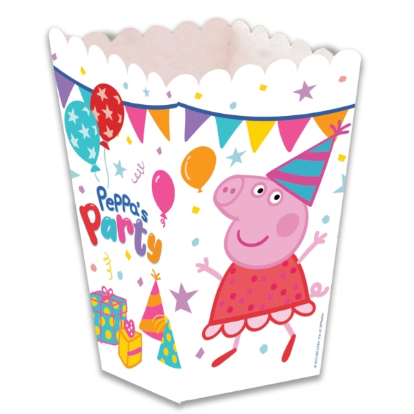 Papírové krabičky na popcorn s motivem Peppa Pig jsou skvělým doplňkem pro dětskou narozeninovou oslavu nebo tematickou party. Veselý design s oblíbenou postavičkou dodá každému občerstvení hravý vzhled a pomůže vytvořit sladěnou party atmosféru.