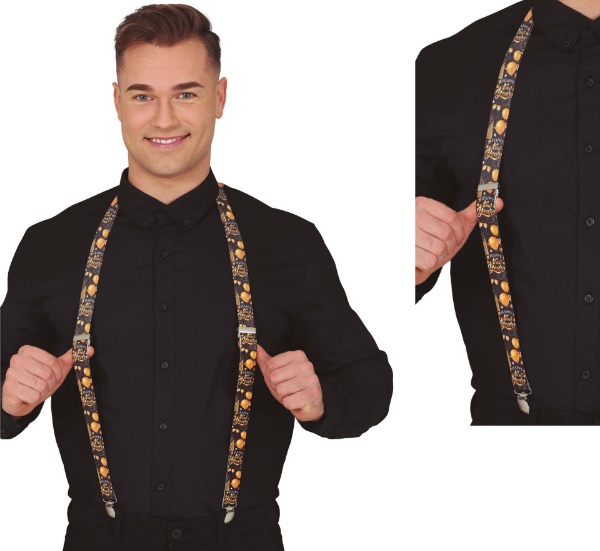 Stylové kšandy (šle) s tematickým potiskem pro oslavu nového roku Happy New Year, vhodné jako univerzální doplněk pro Silvestrovskou party. Je to skvělý doplněk například pro barmany a číšníky, které neomezuje v pohybu a prostě ladí. Stačí doplnit stylovou košilí a je hotovo. Kšandy se zapínají pomocí cvočků.