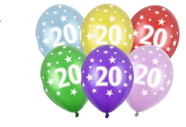 Kulatý latexový balónek s potiskem čísla 20. Je určený pro nafukování heliem i vzduchem. Při nafouknutí heliem vydrží létat cca 12 hodin. Je zvláště vhodný na oslavy narozenin nebo výročí. Dostupný v různých metalických barvách.