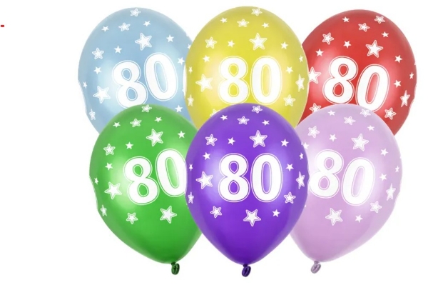 Kulatý latexový balónek s potiskem čísla 80. Je určený pro nafukování heliem i vzduchem. Při nafouknutí heliem vydrží létat cca 12 hodin. Je zvláště vhodný na oslavy narozenin nebo výročí. Dostupný v různých metalických barvách.