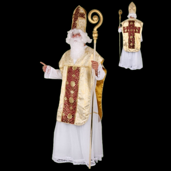 Součástí kostýmu je dlouhá bílá košile s krajkou, přes kterou se obléká bohatě zdobený zlatý ornát s vínovým pruhem a vyšívanými detaily. Nechybí ani vysoká mitra (čepice) ve stejném designu. Zadní část ornátu je zakončena velkým zlatým křížem. Celý komplet působí důstojně a slavnostně.