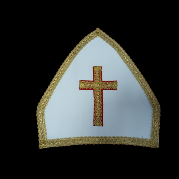 Bez pořádné bílé mikulášské čepice se zlatými aplikacemi by nebyl kostým Mikuláše úplný. Tato slavnostní mitra je navržena tak, aby perfektně ladila s tradičními mikulášskými oděvy. Je zdobená zlatou krajkou po celém obvodu a výrazným křížem na červeném podkladu, který dominuje přední straně.
