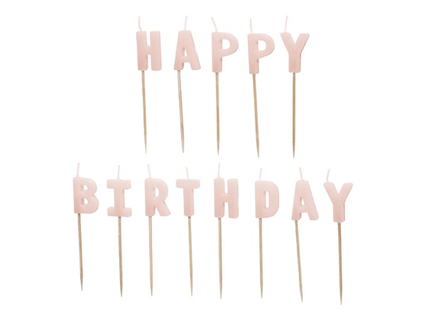 Narozeninové svíčky na dort v růžové barvě, které jsou umístěny na dřevěném zápichu. Z jednotlivých písmenek sestavíte nápis Happy Birthday a jednoduše jej zapíchnete do narozeninového dortu. Velikost každé svíčky je na výšku cca 2,5 cm a dřevěný zápich má výšku cca 5 cm.