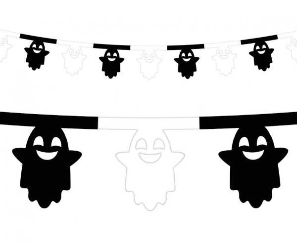 Papírová girlanda duchové v bílé a černé barvě, vhodná na zavěšení při halloweenské akci.