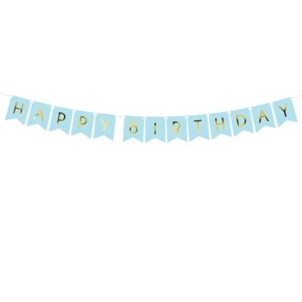 Girlanda Happy Birthday z vlaječek v modré barvě se zlatým textem vhodná na narozeninovou party nebo oslavu chlapečka.