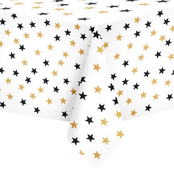 Bílý plastový ubrus s černými a zlatými hvězdičkami o velikosti 137 x 274 cm, vhodný jako dekorace i ochrana stolu na tematickou párty, oslavu narozenin i silvestrovský večer.