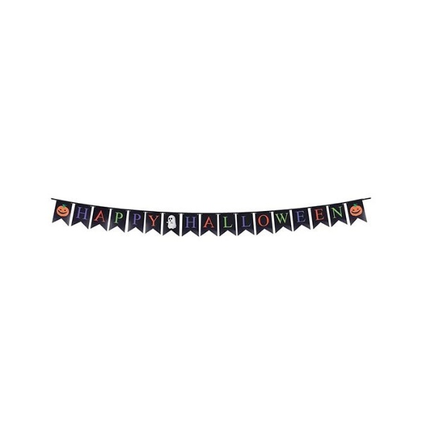 Vlaječková girlanda černá - Happy Halloween 300 cm. Veselý papírový nápis Happy Halloween na černém pozadí, doplněn duchem dýněmi na začátku a na konci nápisu. vhodný pro výzdobu místnosti na halloweenskou party.