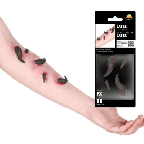 Umělé pijavice - Halloweenský doplněk ke kostýmu. Nalepovací pijavice, jako děsivý doplněk k Halloweenskému kostýmu. Vhodná na jakoukoliv tematickou party. Hodí se jako doplněk ke kostýmu na halloweenskou party krvavou i hororovou party nebo karneval.