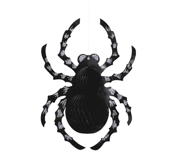 Tento závěsný pavouk zaujme na první pohled – tělo z černého voštinového papíru vytváří prostorový efekt a lesklé stříbrné glitry na nožičkách dodávají celé dekoraci extra strašidelný nádech. Ideální na večírky, výlohy, školní Halloween nebo domácí strašidelný koutek. Jednoduché zavěšení pomocí očka na horní části.