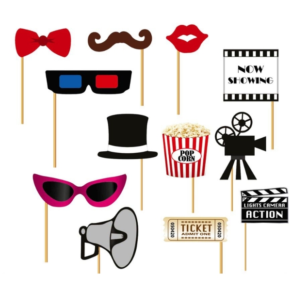 Sada rekvizit do filmového fotokoutku je skvělým doplňkem na tematickou oslavu ve stylu Hollywood, filmový večer nebo narozeninovou party. Balení obsahuje 12 výrazných motivů inspirovaných světem filmu – klapku, popcorn, filmovou kameru, 3D brýle, knír, cylindr, mašli, rty a další ikonické prvky.
