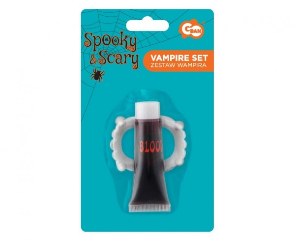 Vytvořte si děsivý upíří look s touto sadou upíra, která obsahuje umělé zuby a tubu s umělou krví. Perfektní doplněk pro Halloween, strašidelný večírek nebo tematické focení.