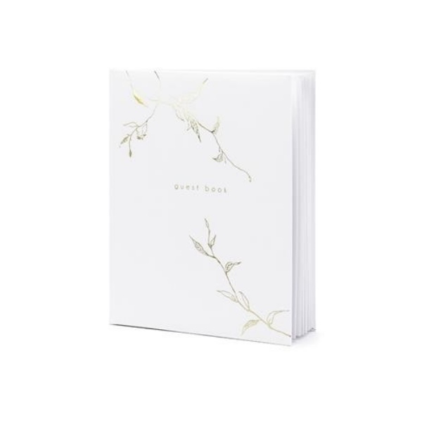 Svatební kniha v bílé barvě se zlatými lístky. Skvělý způsob, jak dostat od svatebních hostí, psanou vzpomínku. Kniha hostů je vyrobena z papíru a tvoří tak decentní a krásný dekorační doplněk na vaší svatbě.
