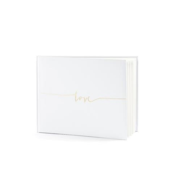 Bílá svatební kniha hostů se zlatým nápisem Love je nepostradatelným doplňkem každé svatby. Hosté do ní mohou zapsat svá přání, rady či osobní vzkazy, díky kterým si uchováte nádherné vzpomínky na tento výjimečný den. Kniha je vyrobena v elegantním minimalistickém designu, který se hodí k jakékoliv svatební výzdobě. S rozměry 21 × 19,7 cm a 22 stránkami nabízí dostatek prostoru pro originální zápisy, básničky i malby vašich hostů.