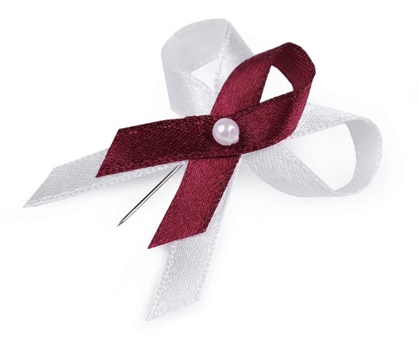 Rozměry: cca 6 × 4 cmMateriál: Saténová stuha, plastová perla, kovový špendlíkBarva: Bordó, bíláBalení: 1 ks