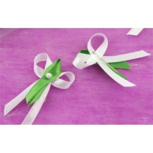 Rozměry: cca 5 cmMateriál: Saténová stuha, plastová perlička, kovový špendlíkBarva: Bílá a zelenáBalení: 1 ksUchycení: Špendlík součástí