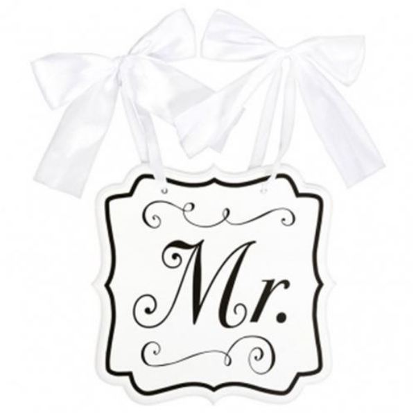 Svatební tabule s výrazným nápisem Mr. v bílé barvě s černým potiskem je stylovým doplňkem, který se hodí na svatební hostinu i na rozlučku se svobodou. Díky ozdobným mašlím lze tabuli snadno zavěsit na židli ženicha nebo do prostoru, kde tak vytvoří krásnou dekoraci a podtrhne atmosféru celé oslavy. Decentní a elegantní design tabule zapadne do každého svatebního stylu a skvěle se kombinuje i s tabulí Mrs.