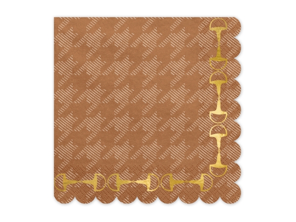 Hnědé ubrousky s jemným vzorem kohoutí stopy a okrajem zdobeným zlatými třmeny dokonale ladí k oslavám s koňskou nebo westernovou tematikou. Hodí se na narozeniny malých i velkých milovníků koní, ale i na pikniky nebo stylové garden party. Díky elegantnímu designu a kvalitnímu zpracování působí velmi reprezentativně.