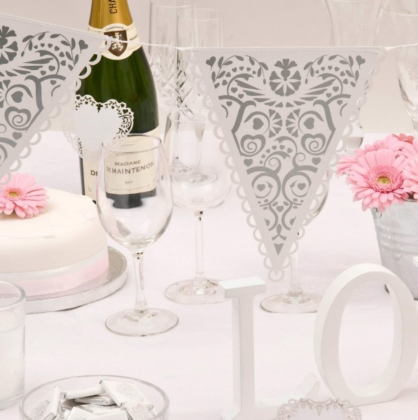 Vlaječková girlanda s ozdobnou krajkou a stříbrným dekorem. Dekorace je vhodná pro vnitřní i venkovní použití a je součástí řady Vintage Romance, stane se krásným doplňkem vaší svatební výzdoby, na křtinách a jiných oslavách.