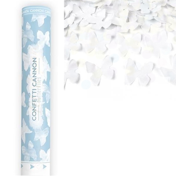 Vystřelovací konfety - bílí motýli - 60 cm. Vystřelovací konfety, jsou skvělý prostředek k vytvoření wow efektu. Hodí se na jakoukoliv oslavu jako jsou oslavy narozenin, svatby, odhalení pohlaví miminka nebo silvestr. Tímto jednoduchým party doplňkem, dotáhnete každou oslavu k dokonalosti.
