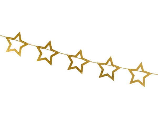 Už zostavená zlatá papierová girlanda v tvare hviezd na zlatom povrázku. Táto girlanda ozdobí nielen oslavu narodeniny, ale hodí sa aj na prípravy Silvestrovskej alebo maturitnej párty. Každá hviezda má rozmer cca 10 x 10 cm a celková dĺžka girlandy je 300 cm. Girlanda je vyrobená z lesklého papiera.